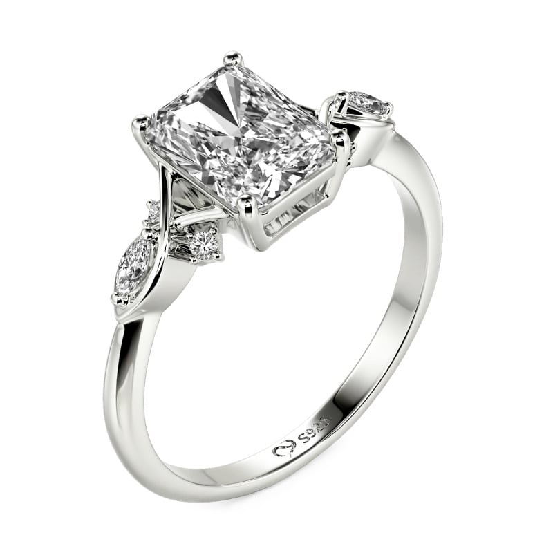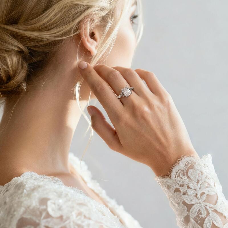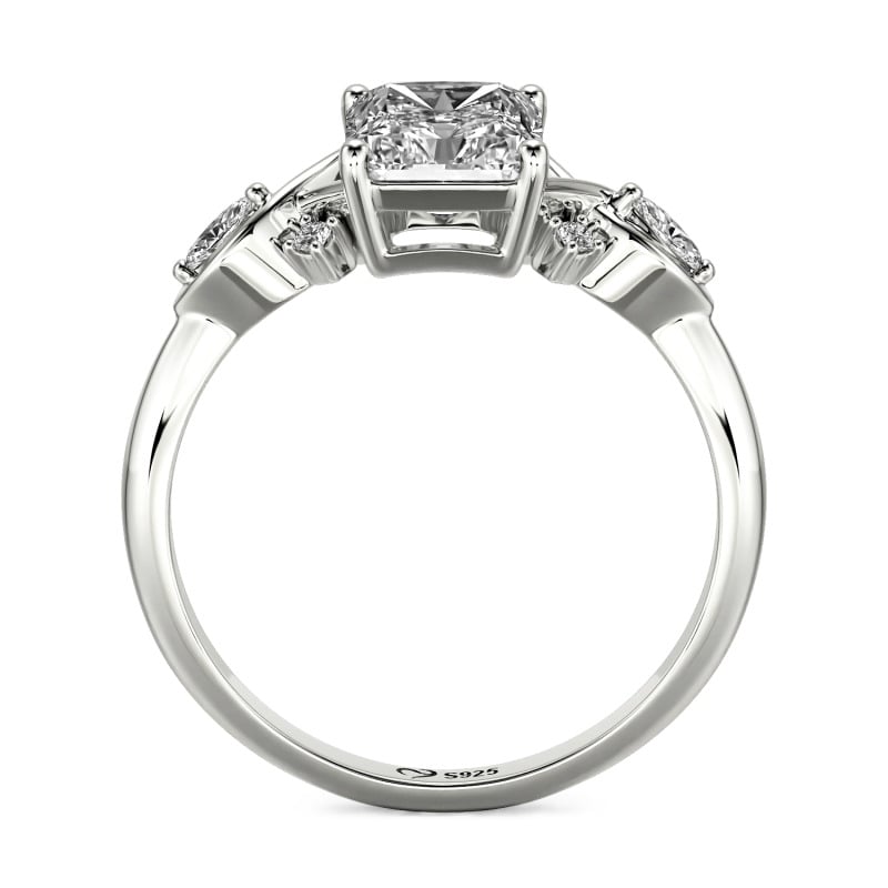 このJeuliaのカスタムインフィニティツイストラディアントカットエンゲージリングは、ラディアントカットの輝きと無限(インフィニティ)の印の深遠な象徴性をシームレスに融合させています。センターストーンにはラディアントカットが施されており、独特なステップファセットがブリリアントなファイアーと相互作用し、目を見張るようなプリズムの煌めきを解き放ちます。バンドは流れるような無限のシンボルへと変容し、二重にねじれたバンドが正確な角度で指を囲むことで、無限の愛情を象徴しながら、クラシックなデザインに現代的なリズムを吹き込みます。全体のシルエットはミニマルでありながらも深い意味を帯びており、膝を折って交わされる厳かな誓いの証人となるのにふさわしく、また、日常の輝かしい瞬間を照らすのにも等しく相応しい存在です。絶え間なく移ろいゆく光と影を通して、このインフィニティリングは時を超えて続く約束を物語ります。