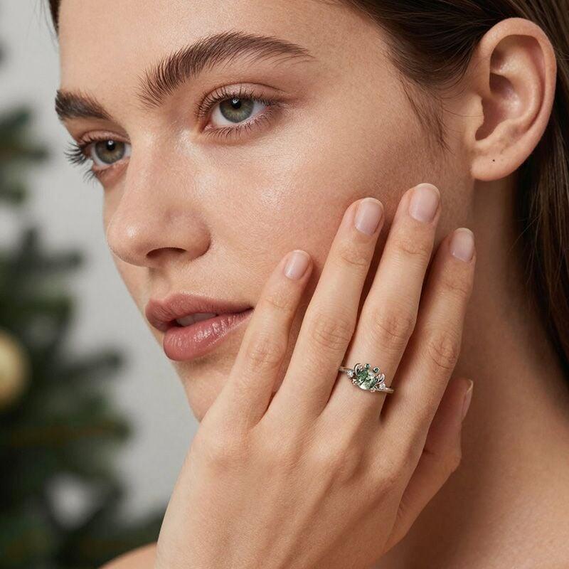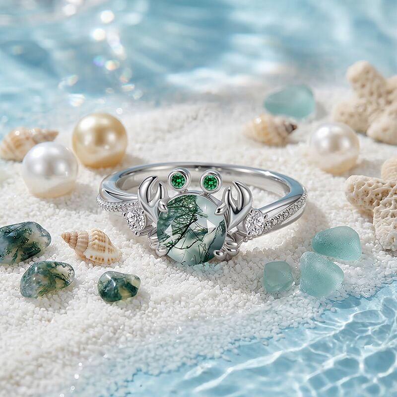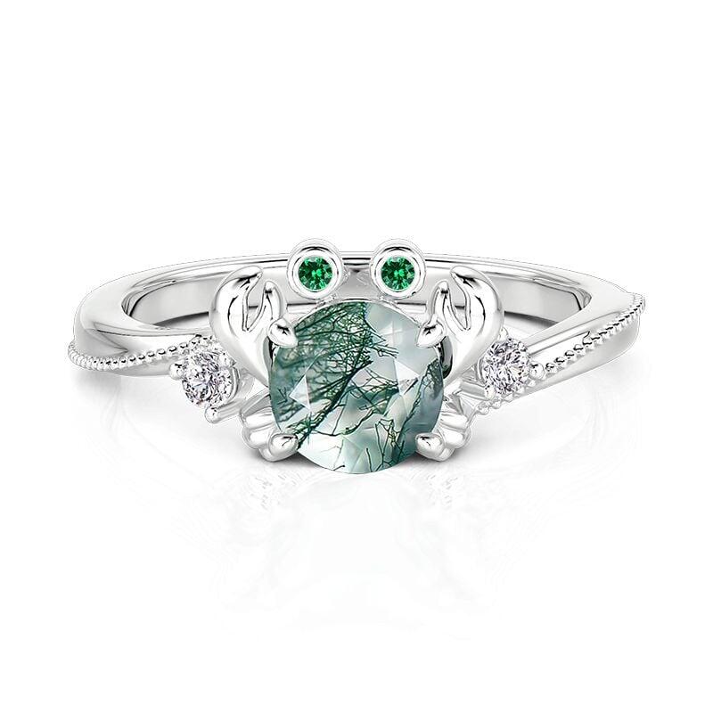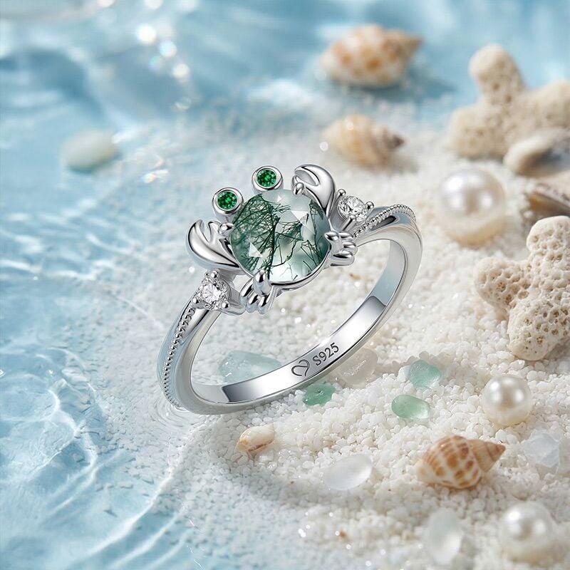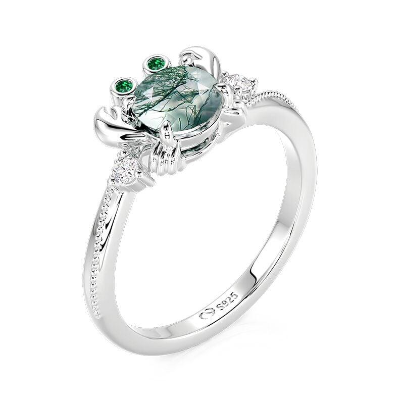 このユーモラスな「Hug Me」リングは、愛らしいバイパスデザインで小さなカニの遊び心あふれる姿を表現しています。中央には、ふっくらとしたラウンドモスアゲートがオーガニックなグリーンの模様で優しく輝き、波しぶきのように煌めくホワイトのアクセントストーンに寄り添われています。小さなグリーンのディテールが愛らしいカニの目を作り、小さな生き物に命を吹き込んでいます。バイパスバンドの縁には繊細なミルグレインビーズをあしらい、軽やかなシルエットにヴィンテージ風の魅力を加えています。海が好きな方や、自然の愛すべきユーモラスな美しさに心惹かれる方に最適。このスターリングシルバー製カニリングは、日常の装いに海岸風のユーモラスな雰囲気を添えてくれます。