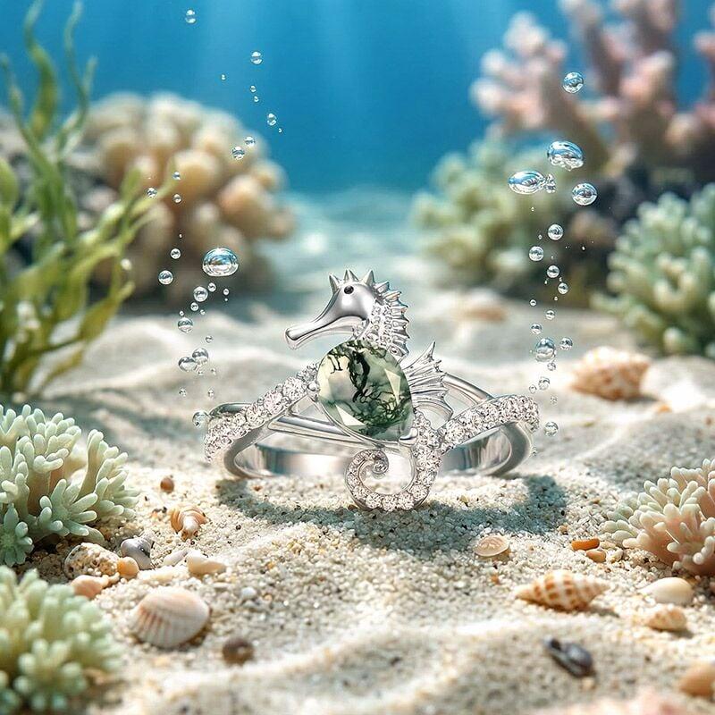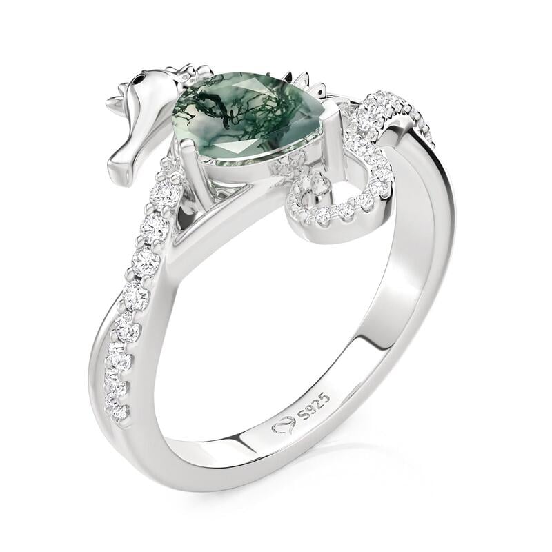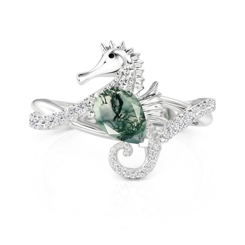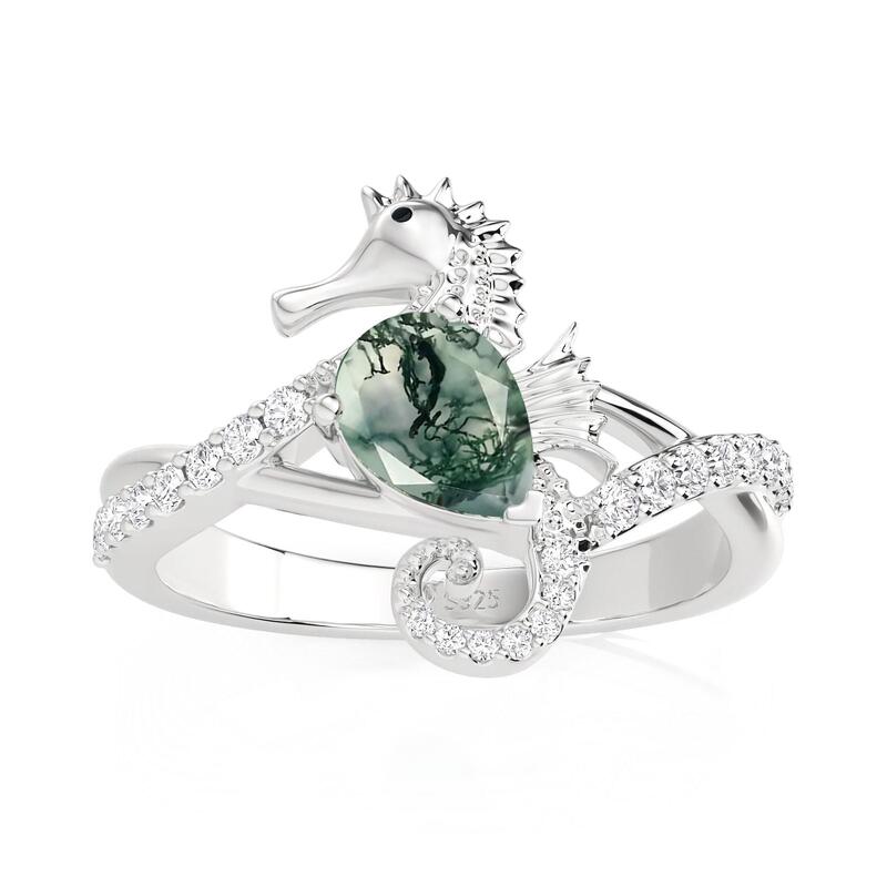 Jeulia ハグミー シーホース エンゲージメント リングは、遊び心あふれる彫刻的なディテールと快適な着用性を融合させています。精巧にモデル化されたシーホースのモチーフが、中央のモスアゲートを抱きしめているかのように見えます。その尾はバンドへとカールし、腕に沿ってパヴェアクセントが配置され、輝きと動きを強調しています。慎重に設計されたセッティングは、ユニークなモスアゲートをしっかりと固定すると同時に、滑らかな内側のプロファイルを維持し、快適な日常使いを実現します。個性と象徴的な温かみに富んだこのモスアゲートリングは、保護、献身、そして自然の静かな美しさを想起させます。プロポーズ、記念日、または人とは違う、意味深い婚約指輪を大切にする人にとって、心に響く選択です。