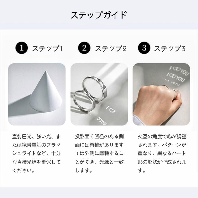 このラブプロジェクションリングはカップルリングで、全体的なリングアームは非常にシンプルで、表面には不規則な幾何学的デザインもあります。最も特徴的なのは、このカップルリングが光で照らされ、どこにでも「愛してる」という言葉が投影されることです。記念日や特別な祭りの贈り物として、お互いにとても大きな驚きを与えること間違いありません。