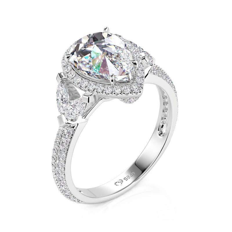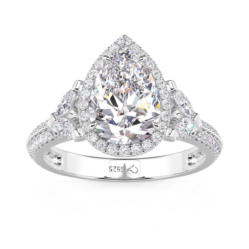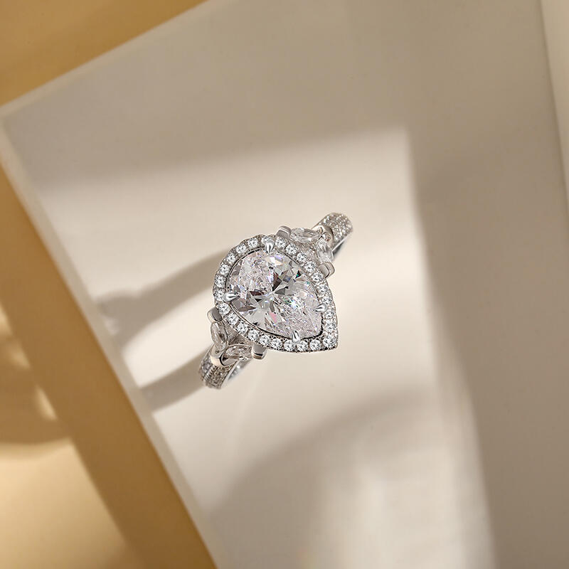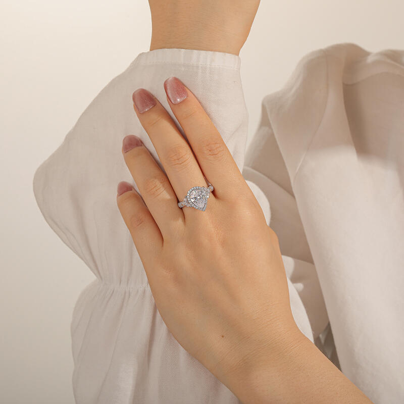 Jeuliaのスターリングシルバー製ヴィンテージハローペアエンゲージメントリング(ラディアントエタニティバンド付き)は、エレガンスとモダンな魅力が見事に調和した、息をのむようなデザインです。中央には輝くペアシェイプのストーンが配され、ブリリアントカットが目を引きつけます。周囲を囲む小さなストーンのハローがその輝きをさらに引き立て、あなたたちの愛の喜びと絆を映し出すようなきらめきを生み出します。細部までこだわったバンドは上質なスターリングシルバーで作られており、耐久性と永遠の美しさを兼ね備えた、変わらぬ愛の象徴です。ユニークなデザインは一生の宝物となり、二人の歩む道のりと交わした誓いをいつまでも思い出させてくれるでしょう。このリングそのもののように輝く愛を体現しています。